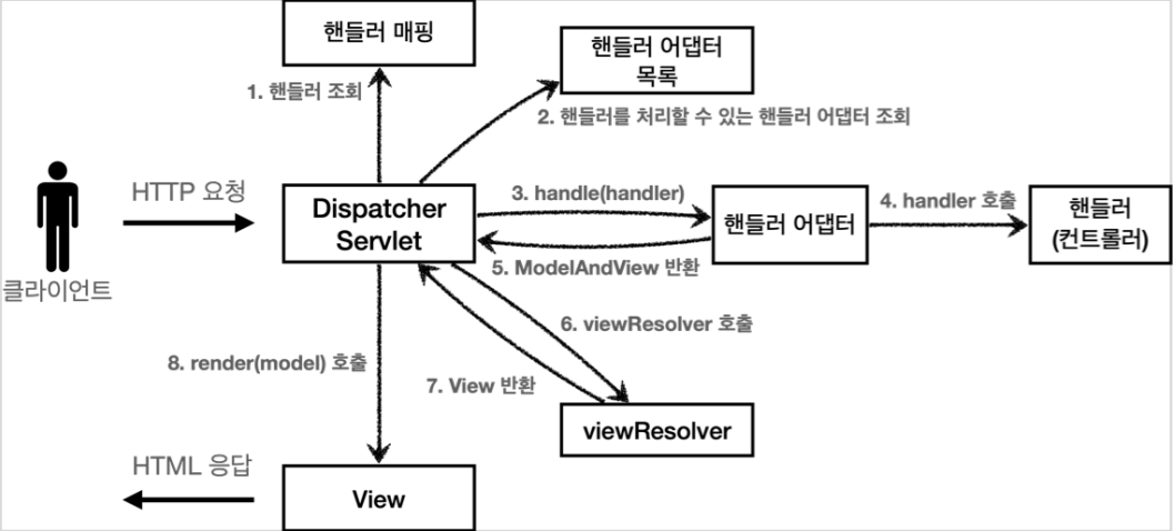 - 핸들러 어댑터 실행 : 핸들러 어댑터를 실행해서 핸들러를 호출한다.