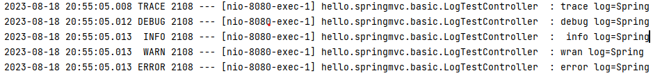 logging.level.hello.springmvc=debug 로 설정할 수 있다.