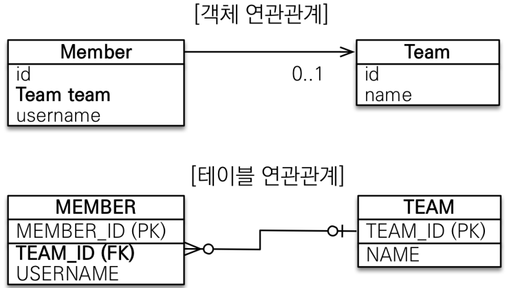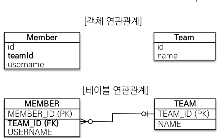 객체는 참조를 사용해서 객체를 찾고 테이블은 외래키로 조인을 사용해서 연관된 테이블을 찾는 차이 점이 있다.
