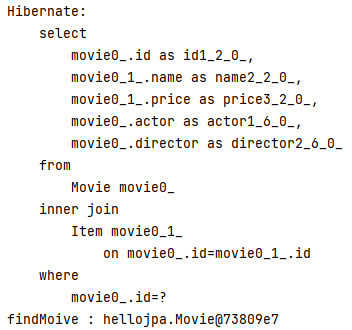 - Movie findMoive = em.find(Movie.class, movie.getId()); Item 타입이 아닌 서브 타입사용