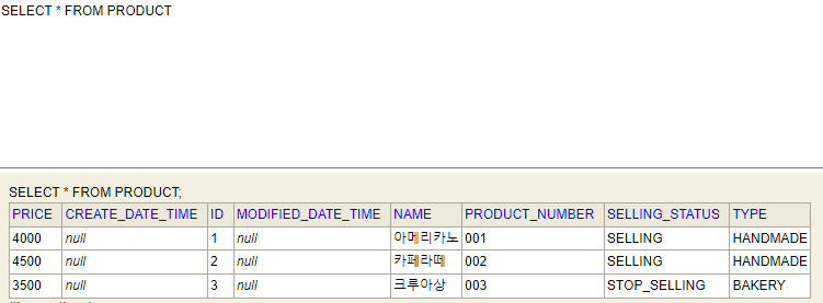 values ('001', 'HANDMADE', 'SELLING', '아메리카노', 4000),