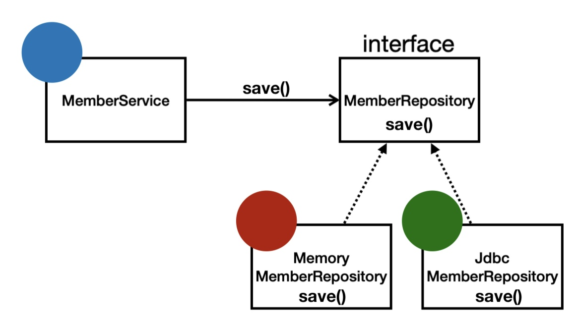 MemberService라는 클라이언트가 있고 MemberRepository라는 interface와 Memory, jdbc로 각각 구현한 MemberRepository가 있다. MemberService는 MemberRepository를 요구하는데 초기에 Memory MemberRepository로 구현되어 있는 MemberRepository를 jdbc MemberRepository로 변경하려면 jdbc를 구현한후 MemberRepository의 변경없이 코드 한 줄만 수정해 주면 변경이 가능하다