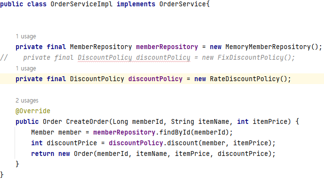 OrderServiceImpl은 DiscountPolicy라는 인터페이스에 의존하면서 DIP를 잘 지킨 것 같지만 구현 클래스(Fix, Rate DiscountPolicy)에도 의존하고 있다 그러므로 FixDiscount에서 RateDiscount로 변경하려면 OberServiceImpl 코드를 변경 해야한다 (FixDiscountPolicy주석 처리하고 RateDiscountPolicy 할당)