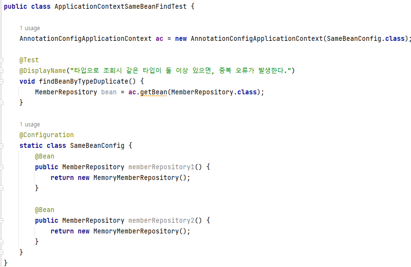 이렇게 동일한 MemberRepository에 대해 타입이 두개인 경우 NoUniqueBeanDefinitionException이 발생한다.
