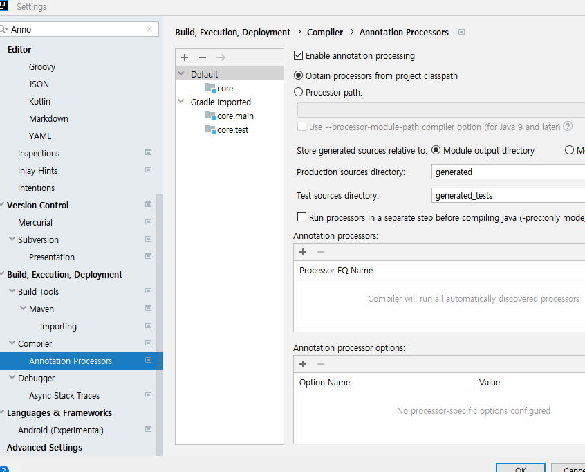 그리고 file -> setting -> Annotation Processors -> Enable annotation processing 체크를 해야 한다.