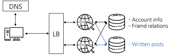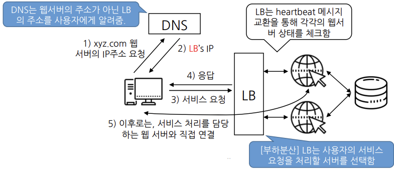 두 웹 서버의 IP가 다르다 그래서 사용자가 서버에 접속할 때 DNS에서 어느 서버의 IP를 주어야 할지 문제가 생긴다. - 이를 해결하기 위해 LB(Load balancer, 부하 분산자)를 도입한다.